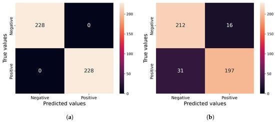(a) Proposed method in this work; (b) Baseline based on the previous work []. Confusion matrices for (a) our method and (b) Park_spatial, which achieved the second-best performance on SMIA tests with an epsilon of 0.1 and 15 iterations for CT segmentation model.