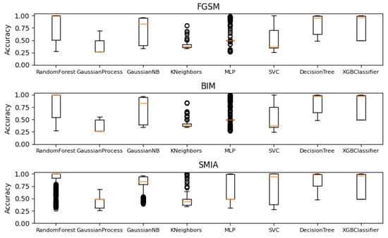 Figure 13 displays box plots comparing the performance of various classifiers when subjected to adversarial attacks. Each plot aggregates results derived from 64 filters and varies according to different epsilon values and iteration counts. From the visualization, it is evident that the random forest classifier exhibits a consistent and robust performance across different attack types, particularly when compared to other classifiers. This empirical evidence from the box plots solidifies the selection of random forest as the primary binary classifier for this work, given its resilience and reliable performance against diverse adversarial challenges.
