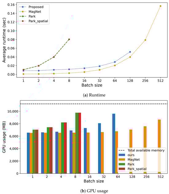 Figure 14a depicts the average runtime per batch size for each method. The figure reveals that the runtime of the proposed method experiences a moderate increase, akin to that of MagNet. However, at a batch size threshold of 256, the proposed method begins to suffer from out-of-memory errors, a problem not encountered by MagNet. This challenge is linked to the volume of model parameters processed by the GPU, as illustrated in Figure 14b. Specifically, the proposed method encompasses 704 parameters, in contrast to MagNet’s 310. Consequently, as depicted in Figure 14b, the proposed method fails to operate at batch sizes starting from 256.