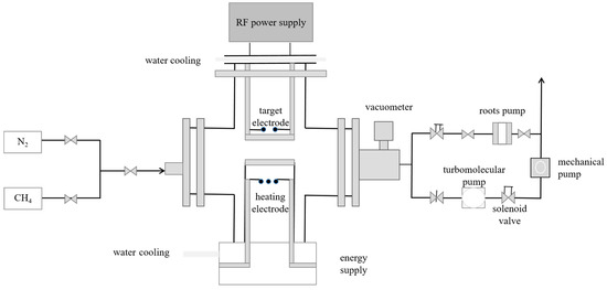 The fabrication of N-DLC thin films was executed utilizing the RF-PECVD technique. Figure 1 illustrates the experimental setup, whereby a stringent vacuuming process was initiated to reduce the chamber’s pressure to below 9.9 × 10−4 Pa before introducing the reaction gases. This procedure ensures the purity of the reaction gases. Methane (CH4) and nitrogen (N2) gases were separately introduced into the vacuum chamber, and the set temperature and radiofrequency (RF) power were adjusted accordingly. The vacuum chamber contains two parallel electrode plates with a fixed spacing. The RF power source is connected to the upper electrode plate, while the substrate is placed at the center of the lower electrode plate. When the RF power is applied, an electric field is generated between the two plates, leading to the dissociation of the introduced gases into a plasma state. High-energy electrons in the plasma collide with the gas particles, activating some of them into reactive species. These reactive species are then adsorbed onto the substrate surface, undergoing a series of complex chemical reactions to ultimately form the thin film. For ease of discussion, the different sample groups are assigned designated numerical codes, and the specific parameter settings are detailed in Table 1.