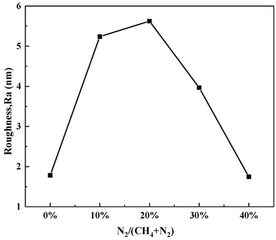 Figure 5 presents the surface roughness variations in the N-DLC thin films. It is evident that Ra initially increases and then decreases with an increasing nitrogen flow rate in the introduced gas. The fluctuations in roughness can be elucidated through the underlying principles governing the thin film deposition process [26]. Upon arrival at the substrate surface, gas-phase atoms experience reflection due to their higher energy levels, while another fraction is adsorbed onto the substrate surface. Adsorbed gas-phase atoms undergo diffusion and migration across the surface, resulting in collisions and coalescence to form small atomic clusters that subsequently condense into clusters on the substrate, leading to increased surface roughness. We can see that when the nitrogen flow rate accounts for 20% of the total gas flow rate, the surface roughness of the sample is the highest. Further increasing the nitrogen flow rate reduces the roughness of the sample, and the addition of more nitrogen elements makes the film smoother.