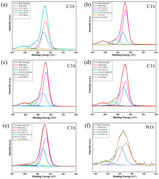 In order to comprehensively investigate the microstructural characteristics of the films, XPS measurements were employed in this study. As shown in Table 2, with an increase in the nitrogen-to-methane gas flow ratio, the relative content of nitrogen measured by XPS also increases, indicating that nitrogen does indeed participate in the carbon network and reacts with it. Lorentzian–Gaussian fitting was performed on the C1s spectra of non-nitrogen-doped DLC films to obtain four different peaks. As depicted in Figure 7a, the peaks at 284.8 eV and 285.08 eV are attributed to the C=C (sp2-C) and C–C (sp3-C) bonds, respectively, while the peaks at 286.47 eV and 288.23 eV correspond to C–O and C=O bonds [28], respectively. For the N-DLC films, Figure 7b–e displays the deconvoluted spectra. The peak at 287.08 eV corresponds to the C–N bond position [33], while the peak at 286.4 eV corresponds to the C–O/C=N position [34]. To gain further insights into the carbon and nitrogen bonding structure, peak fitting was carried out on the N1s spectrum of the C1N4 sample as a representative, as illustrated in Figure 7f. According to Table 2 and Figure 7f, nitrogen and carbon can form C–N and C=N bonds. The sp3 phase is most abundant in the film with an elemental nitrogen content of 2.04%. XPS results show that we successfully doped nitrogen in the DLC film. From Table 3 and Table 4, it can be seen that as the nitrogen flow rate increases, the nitrogen content in the DLC film also increases. sp3 increases first and then decreases with the addition of nitrogen. A slight increase in nitrogen content will promote the formation of sp3 bonds. This is consistent with the Raman analysis.