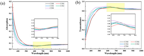 To analyze the optical characteristics, the absorbance and transmittance spectra of the samples were measured using a UV–Vis spectrophotometer. The relationship between transmittance (T), reflectance (R), and absorbance (A) for different nitrogen flow ratios can be expressed as A + R + T = 1, where A represents light absorption, and R and T are the reflectance and transmittance, respectively. Figure 8 presents the spectra of the various sample groups under distinct nitrogen flow ratios. The sample exhibits high transparency in the infrared range. In the ultraviolet and visible-light ranges, as the nitrogen flow rate increases, the light absorption rate also increases. This is likely because the increase in nitrogen flow rate increases the sp2 phase, enhancing the light absorption rate. Moreover, notable variations in transmittance are evident among different sample groups within the same wavelength range. At a wavelength of 368 nm, the difference in ultraviolet transmittance can even reach 25.62%. The optical properties of the N-DLC coatings are influenced by the nitrogen doping and the resulting microstructural changes, contributing to the varied levels of light absorption and transmittance observed in the different sample groups.
