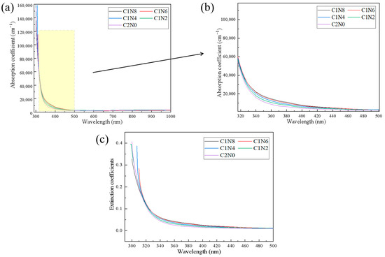 The absorption coefficient and extinction coefficient of the sample. (a) Absorption coefficient plot of the sample; (b) Partial enlarged image of the Absorption coefficient of the sample; (c) Extraction coefficients diagram of the sample.