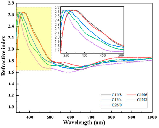 We can also calculate the refractive index of N-DLC thin films using Equation (3), where R is the optical reflectance, and K represents the extinction coefficient [22]. The variations in the refractive index with wavelength for different samples are depicted in Figure 11. We can see that in the UV range, the values of the maximum refractive index do not differ much, only the corresponding wavelengths are shifted. In the visible range of 600–700 nm, several refractive index curves have more intersections and the refractive index of the film changes significantly as the gas flow rate is changed. These variations are attributed to changes in the polarization of light induced by alterations in the content and clusters of sp2 within the films.