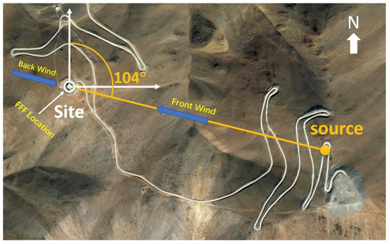 where λ represents the electromagnetic wave’s wavelength, and D signifies the aperture of the telescope [9]. Upon substituting D = 0.72 m and λ = 2 × 10−3 m, the calculated L results in 490 m. Considering these distance requirements, a pragmatic approach was taken to select a suitable installation location on the mountain for the source. This decision determined the orientation of the FFF, which is positioned at a bearing of 104° east of north. The chosen orientation, along with the prevailing wind direction, will affect the wind loading magnitude on the FFF. Consequently, the distance between the source and the reflective mirror is 1500 m, much greater than the minimum distance requirement of 490 m. The actual situation is shown in Figure 1.