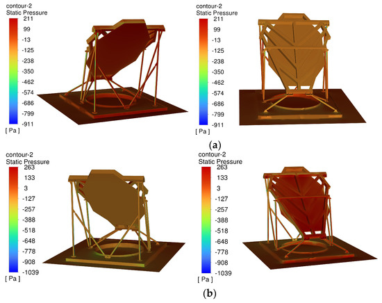 Figure 11. Pressure distribution maps on the reflective mirror surface after applying pressure: (a) Pressure contour plot for wind from the front. (b) Pressure contour plot for wind from the back.