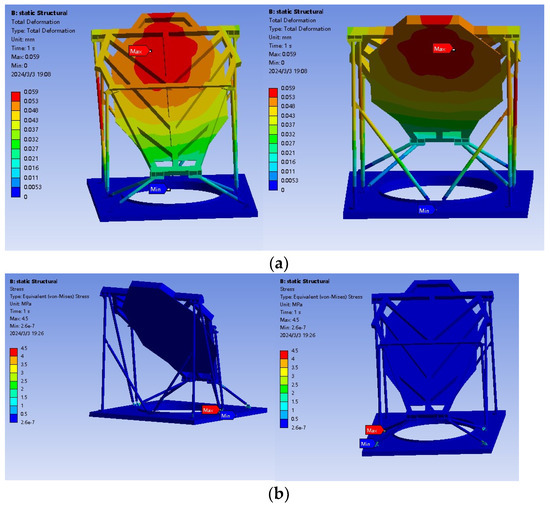 Figure 14. Results after applying surface pressure calculation: (a) Deformation contour plot of the reflective mirror under front wind. (b) Stress contour plot of the reflective mirror under front wind.