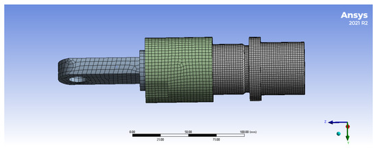 Mesh the model primarily using hexahedral grid elements with a size of 3 mm. A total of 27,471 mesh elements and 112,932 nodes were yielded, and the mesh quality exceeded 0.85, as illustrated in Figure 17.