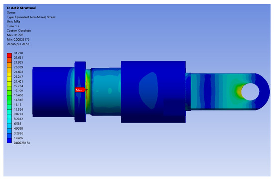 The analysis results are shown in Figure 18. The maximum stress within the connecting structure is 31.27 MPa, located in the relief notch of Rod 1 and presented as the concentration of stresses in the root corner. A yield strength of 6061 (280 MPa) is eight times the maximum stress, so it can be concluded that this connecting structure remains safe under actual working conditions according to the principles of the fourth strength theory.