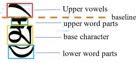 The “Tibetan-Sanskrit” large character set contains 7238 categories of characters, and they are split into parts. Each Tibetan character may consist of one or more components superimposed above and below each other, and each character must contain a base character component, which consists of the Tibetan consonant characters. Zero, one or more upper vowel parts and upper word parts can be superimposed on top of the base character parts, while zero, one or more lower vowel parts and lower word parts can be superimposed below the base character parts, as shown in Figure 2.