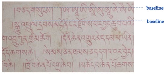 If the top of the base character of a Tibetan character without a superscript is called the head, while for cases with a superscript, the head of the character is the top of the superscript. The ancient Tibetan characters are written horizontally with the heads of each line of characters aligned in the vertical direction, which is shown by the fact that the head of each character is almost always aligned in a straight line, calling this straight line the baseline, as shown in Figure 4.