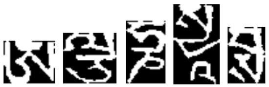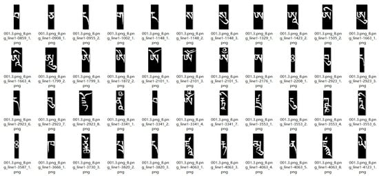 At present, there is no publicly available sample set of Tibetan ancient Chinese characters in Ugandan script images. In this paper, we use the image samples synthesized from Tibetan historical document characters to assist in training the model and use the obtained model to perform unsupervised recognition of unmarked real Tibetan historical document images. The main idea of the sample synthesis is, firstly, the components in the above table are manually selected from the images of the Tibetan antique documents and saved. Each component is saved as an image file, and each image file can be used as a character component sample. In practice, the number of character parts is unevenly distributed, with some parts appearing extremely frequently, and it is very easy to obtain a sufficient number of character part images, while others appear very infrequently and a small number of parts require data augmentation by randomly rotating the character part images by an angle of less than 10 degrees. In addition, there were a few parts that did not appear in the selected Tibetan document images, and in this case, they were copied by hand by copying and drawing the character parts in the drawing software. Secondly, the components obtained in the first step were stacked in the desired order to obtain a composite sample image of the Tibetan characters. In order to make the composite characters more closely resemble the characters of the Tibetan document image, we also extracted the location information of each Tibetan character component from the printed Tibetan character images, which are the coordinates of the upper left and lower right corners of the character component in the overall character image. Finally, according to the number of synthesized samples required, all characters in the “Tibetan-Sanskrit” large character set are loaded with information on the split structure and position of the components, and the corresponding character components are selected, randomly rotated by less than 5 degrees and output to a rectangular area in the corresponding position of the character component image. This character synthesis method was successfully applied in the literature [23,24]. In this paper, 519 types of samples were synthesized, 1000 for each type. A partial demonstration of the synthesis sample is shown in Figure 3.
