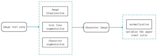 The images of ancient Tibetan documents are binarized, line-sliced and word-sliced to obtain character images. Then, the character image is normalized by optimizing the ratio of the upper vowel. The processing flow is shown in Figure 7.