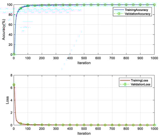 It can be seen in Figure 1 that the stability is reached at about 300 iterations, the recognition accuracy of the training set is 99.875%, and the recognition accuracy of the validation set is 99.3773% at the 300th iteration. The loss in the training set is 0.0073, and the loss in the validation set is 0.0217. The recognition accuracy of the Down-CNN model is 99.48% in the validation set and 99.45% in the test set. The overall recognition accuracy of the synthetic dataset below the baseline is 99.77%.
