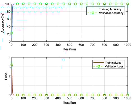 (2) There are 13 classes of above-baseline synthetic samples, 70 of each class, totaling 910, and the recognition model of above-baseline characters (Up-CNN) is trained by the synthetic above-baseline samples. The samples were randomly divided into training, validation and test sets with the proportions of 70%, 10% and 20%, respectively. The experimental parameters are set as follows: random gradient descent, the number of samples per batch is 1000, the initial learning rate is 0.1, the maximum number of rounds is 1000, and the learning rate changes with the number of iterations in segments. The specific variation rule is used for every 150 rounds of training, and the learning rate = learning rate of the previous round * 0.1. The training took 3 min and 15 s, and the experimental results are shown in Figure 10.