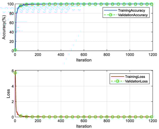 It can be seen from Figure 9 that the proposed model performs well on the synthetic sample set. It reaches stability at about 500 iterations, and the accuracy of the training set is 99.375%. The accuracy of the validation set is 99.458% at the 500th iteration, with a loss of 0.0210 for the training set and 0.0207 for the validation set. The accuracy of the validation set is 99.84%, the accuracy of the test set is 99.80%, and the overall recognition rate of the synthetic data set is 99.93%.