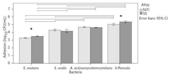Comparison of bacterial adhesion to alloys. Columns show mean values with 95% confidence intervals. Asterisks indicate significant differences between alloys for the same bacterium, and horizontal lines connect bacteria with a significant difference within the same alloy.