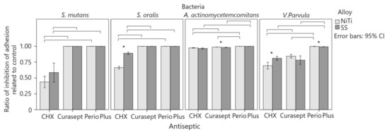 Although there were differences between the strains and the tested agents, it can be concluded that Perio Plus most effectively inhibited the adhesion of all tested bacteria to the SS and NiTi alloys. A. actinomycetemcomitans was the most sensitive to all tested agents, while S. mutans showed the highest resistance. The effectiveness of the tested agents was better on NiTi alloys.