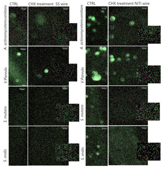 Representative images of bacteria adhering within 4 h to NiTi and SS wires with and without CHX treatment. Biofilms were stained with the LIVE/DEAD Sustainability Kit (FilmTracer™ LIVE/DEAD® Biofilm Viability Kit, Invitrogen). Green cells represent viable, live bacteria, while red cells represent dead bacteria.