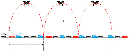 The task of utilizing UAVs as intermediate relay bridges to facilitate the construction of VANET networks for enabling communication between two vehicles that are not within direct range of each other has been extensively studied in previous research papers. However, this specific scenario is not the focus of this paper. Instead, this paper primarily focuses on studying the connections formed within the communication range of a UAV. Each UAV categorizes and prioritizes all vehicles within its coverage area based on their speeds. By calculating the total delay, performing comparisons, and making optimal allocations, this paper aims to provide a detailed explanation. The relationship between drones and vehicles’ positions is as shown in Figure 2.