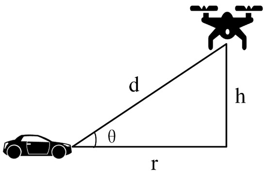 The speed of each vehicle is gathered at location and remains constant until it exits the communication range of the UAV. At any given time, a vehicle establishes an uplink connection with the UAV. To ensure that the UAV can receive signals from each vehicle and obtain signal strength, this model is considered to be composed of both LoS and NLoS links [22]. Depending on the UAV’s position and flight altitude, these links will have different probabilities. The vehicle K’s position is defined as , while the UAV’s position is , and must be optimized to satisfy QoS constraints. As shown in Figure 2, according to the Euclidean distance, the distance d between vehicle k and UAV u can be written as: