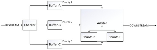 The information enters the frame-header Checker from vehicles on the Up Stream and the message priority is determined. The information transmitted by vehicles in the high-speed section enters Buffer-A as high-priority, while that transmitted by vehicles in the medium-speed section enters Buffer-B as medium-priority and that transmitted by vehicles in the low-speed section enters buffer Buffer-C as low-priority. The Arbiter is responsible for scheduling the transmission order on the output link and accessing the outgoing packets. If a medium-priority packet is interrupted by a high-priority packet, a breakpoint is set, and the remaining packets are transferred to Shunts B. If a low-priority packet is interrupted by a high- or medium-priority packet, a breakpoint is set and the remaining packets are transferred to Shunts C. We assume that the time it takes for packets to be transmitted to the buffer is negligible [47].