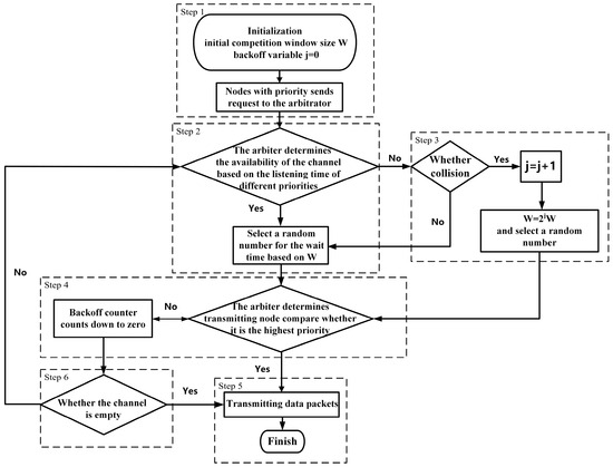 The following is a description of the protocol steps for the Preemptive-Resume Priority 802.11 CSMA/CA [48] with an arbiter in this article; the flowchart is shown in Figure 5.