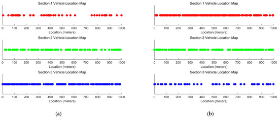 Scenario 1 and 2 Vehicle Location MAP. (a) Scenario 1 and (b) scenario 2.