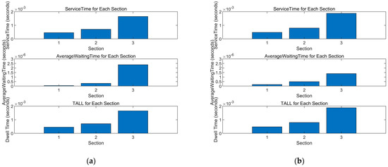 The specific data in Figure 10a are as follows: , . Figure 10a shows that due to the low number of vehicles in the higher priority segment (Priority 1) and the smaller collision probability P at the stations, the vehicles in the higher speed range can send data packets with little waiting time and have shorter processing times compared to other speed ranges. This finding aligns with the real-world scenario. On the other hand, for the medium and lower speed ranges corresponding to Priority 2 and 3, the delay increases. Vehicles in the lower speed range need to wait for some time before sending data packets. This matches the initial design intention of this study.