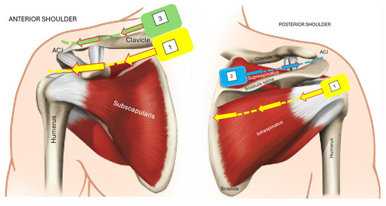 - Wong, M.; Kiel, J. Anatomy, Shoulder and Upper Limb, Acromioclavicular Joint; Ochsner Clinical School, University of Florida College of Medicine-Jacksonville, Ed.; StatPearls Publishing: Treasure Island, FL, USA, 2021; Available online: https://www.ncbi.nlm.nih.gov/books/NBK499858/#!po=15.6250 (accessed on 25 September 2023).