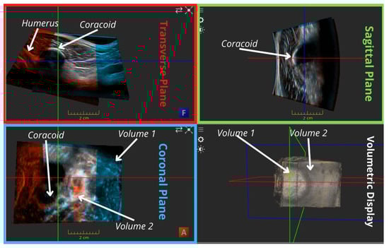 An example of manual registration of a pair of consecutive US volumes by identifying and overlaying common features in the ImFusion software (https://www.imfusion.com/, accessed on 20 May 2022). In this case, the common feature is the coracoid process. The three view panels from the top left to bottom left show the transverse (red), sagittal (green) and coronal (blue) plane representations of the volumes. The bottom-right panel corresponds to the 3D volumetric display of the two selected volumes.