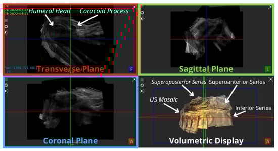 Anterior view of the 53 3D US volumes overlaying each other, the US mosaic of the rotator cuff region of a subject’s shoulder. The three view panels from the top left to bottom left show the transverse, sagittal and coronal plane representations of the volumes. The bottom-right panel corresponds to the 3D volumetric display of the US mosaic.