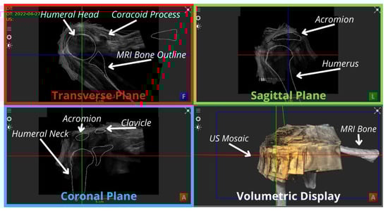 Anterior view of the US mosaic overlaying the bony segmentations of the MRI, focusing the 3 planes on the humerus.