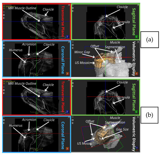 There are literature reports on the US mosaic reconstruction of the liver and kidneys by using an optically tracked 3D US probe and experimenting with various registration techniques [16]. Ref. [17] registered multiple 3D cardiac US volumes using US probe tracking in order to compare various US volume compounding techniques (volume merging techniques) and assessed the resultant combined volumes with the help of 3D US experienced clinicians. Another example is the use of high-refresh-rate 3D US and its registration to MRI data in specific applications, such as the reconstruction of the intra-articular anatomy of the knee for arthroscopy [18]. Similarly, [19,20,21,22] registered intraoperative 3D US data to preoperative MRI and CT data for assisting and automating surgeries. But the literature on the registration of 3D US images of the shoulder or volumetric reconstruction of the rotator cuff is very limited. US volume registration can be automated [23]. However, registrations typically rely on segmented US images, other imaging modalities and tracking systems which impose limitations on the US image acquisition and add labour to the post-process operations. The amount of work required to segment the external modalities and US images as well as perform the registrations is typically significant [17,19,20,22,24,25,26,27,28]. This work investigates the feasibility of employing manual 3D US-US registration to reconstruct a single clinically viable US volume (a mosaic) of the entire rotator cuff region, which could be used to reduce the clinical competency needed to acquire and interpret shoulder US data and offer a CT/MRI-like view of the anatomical region. This study utilises expert sonographers and clinicians and corresponding participant shoulder MRI data to validate the clinical usefulness and reconstruction accuracy of the mosaic. This way, US can be more viable for pre-operative and intraoperative surgical planning and becomes more display-friendly for patients being examined and novice US learners. This work is preparatory for the ultimate goal of training a deep learning algorithm to automatically register US shoulder mosaics in real-time. The main significance of this study lies in the newfound understanding that by combining information from multiple 3D US volumes, all the necessary structures in the shoulder can be effectively visualised. This insight suggests that with improvements implemented to the hardware and algorithms utilising the newly discovered challenges, once sufficient US mosaic data have been collected for multiple participants, a deep learning-based 3D US registration algorithm may be trained to reconstruct 3D US shoulder mosaics in real-time, addressing all the previously discussed gaps.