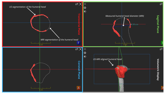 Aligned MRI and US mosaic segmentation of the humeral head: measured diameter between identified tips in the humeral head MRI segmentation.
