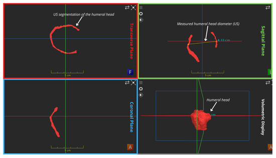 Regarding evaluating the reconstruction error by anatomical distance measures, Figure 6 illustrates the aligned US mosaic and MRI segmentations of the humeral head, focusing on the humeral head diameter measured between two identifiable points in the MRI segmentation. The MRI segmentation of the structure was within the thickness range of the US mosaic segmentation on all planes with a mild misalignment on the sagittal plane. Figure 7 shows the corresponding distance examined in the US mosaic. As shown in the two figures, the corresponding humeral head diameters were identical in both modalities at 43.3 mm, resulting in a reconstruction error of 0 mm. As for the inter-anatomical distance, Figure 8 shows the distance between the tip of the acromion and the humeral head, measured as 14 mm in the US mosaic and 15.2 mm in the MRI, respectively, corresponding to a reconstruction error of 1.2 mm.