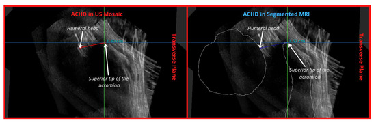 Measured corresponding distances between the 2 points, in the acromion and the humeral head, in the US mosaic (left) and MRI segmentation (right) across the transverse plane.
