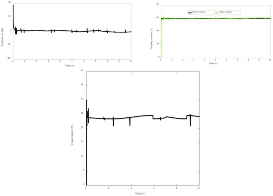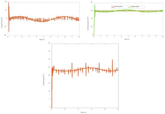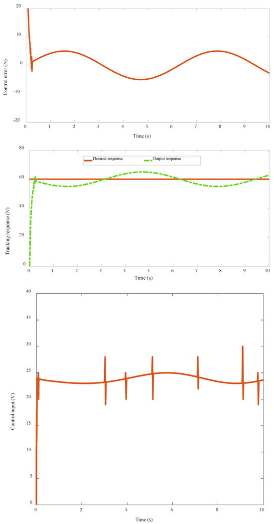 Experimental results of the step response are shown in Figure 14, Figure 15, Figure 16 and Figure 17, and experimental results of the sine response are shown in Figure 18, Figure 19, Figure 20 and Figure 21. Figure 14 and Figure 18 show the experimental results of the step response and sine response of the PID, with an average control error of 5.545N. Figure 15 and Figure 19 show the experimental results of the step response and sine response of the SMC(sgn), with an average control error of 2.245N. Figure 16 and Figure 20 show the experimental results of the step response and sine response of the SMC(sat), with an average control error of 3.30N. Figure 17 and Figure 21 show the experimental results of the step response and sine response of the AFSMC, with an average control error of 1.325N. Compared with PID, SMC(sgn), and SMC(sat), the control errors of AFSMC are reduced by 76.1%, 40.9%, and 65.9%, respectively.