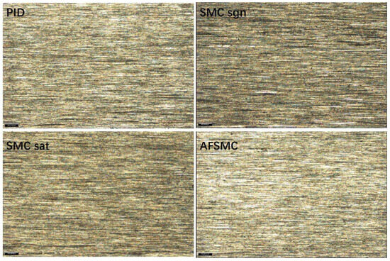 After analyzing the experimental results of the step response and sine response, it can be found that the experimental results and simulation results of different control algorithms have the same change trend. According to the change of control error and high-frequency chattering in Table 2, it can be seen that AFSMC has the best control effect.