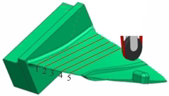 The 3D coordinate measuring machine is used to measure the form and position accuracy error of the blade as shown in Figure 23b. The polished blade is divided into 5 sections to measure the error of the blade profile, and the test results are obtained after scanning and data processing, as shown in Figure 25 [38,39]. Three measuring points are sampled at different sections of the blade basin and back, and the normal error of the measuring points is used to represent the form and position accuracy error of the polished blade.