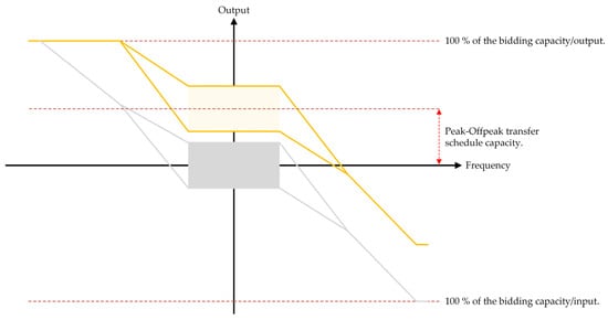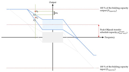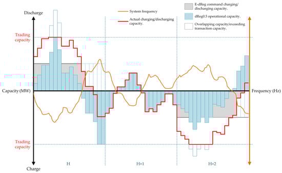 Table 1 outlines the schematic operation of the enhanced dynamic regulation reserve (E-dReg) during actual operation. During the energy transfer scheduling period, the command for energy transfer must be executed simultaneously with the frequency regulation service. If the overall output capacity exceeds the contracted transaction capacity with Taipower, only the maximum transaction capacity will be output. In the event that the frequency surpasses the critical threshold of 60 Hz ± 0.5 Hz, the command for energy transfer must be temporarily suspended for 900 s. After the 900 s pause, the execution of the original energy command can resume.