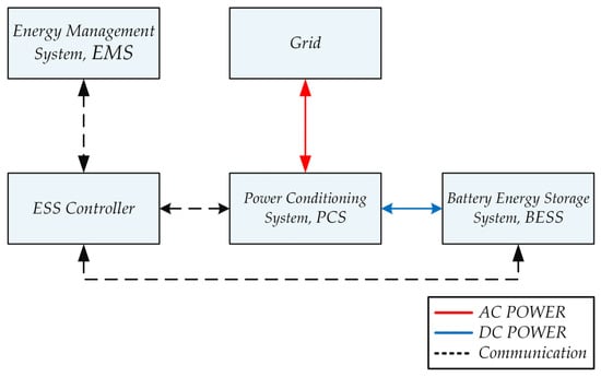 The architecture of the enhanced dynamic regulation reserve system mainly consists of energy storage units and a monitoring and dispatch management system. It includes components such as the power grid (Grid), power conditioning system (PCS), battery energy storage system (BESS), energy management system (EMS), and controller. The schematic diagram of the system architecture is illustrated in