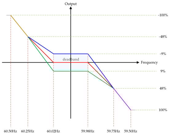 Table 2 provides a corresponding comparison between the charging/discharging calculation and the output setting values. The control strategy will calculate the charging/discharging control quantity based on the current grid frequency and SOC status, selecting different slope curves for computation. The calculation of the charging/discharging control quantity will be performed using the slope-intercept form to determine the slope and intercept of the curve, as shown in Equation (4). Here,