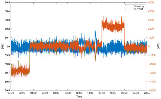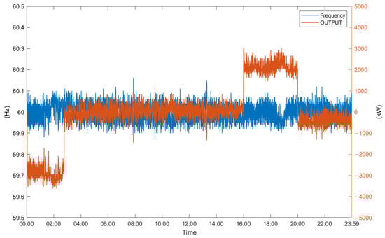 To validate the proposed control strategy for E-dReg in this paper, the control strategy will be implemented within the controller in this section’s control tests. Through actual 24 h frequency regulation control and electricity transfer scheduling, data obtained from the real control tests will be analyzed to observe the data variations in frequency-corresponding output and SOC. Additionally, the execution efficiency of the E-dReg controller will be evaluated by examining the system benefit to schedule performance metric (SBSPM) at the end of the full-day operation.