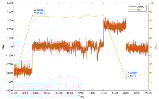 Figure 9. Additionally, two new limiting conditions have been added for SOC during the execution of the energy transfer schedule for charging and discharging actions. The limiting conditions for charging and discharging protection are expressed in Equations (2) and (3). When the SOC is less than or equal to 82.5%, the slope for output calculation is determined based on the green segment. For SOC falling within the range of greater than 82.5% but not exceeding 87.5%, the slope for output calculation is based on the red segment. Finally, when the SOC exceeds 87.5%, the slope for output calculation is determined based on the blue segment.