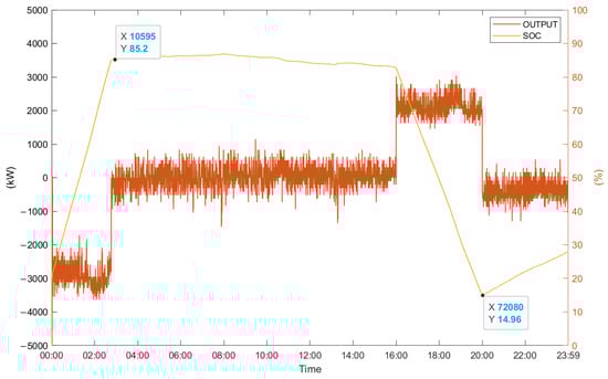 Figure 15, respectively, depict the curves of the output power corresponding to the SOC after testing. From these two charts illustrating the SOC variations, it can be observed that during the charging period, the SOC baseline is charged to the set 85% by the frequency regulation strategy before stopping the charging action. This clearly demonstrates the protective effect of the added SOC upper and lower limits. Additionally, after the discharge schedule ends, it can be observed that the SOC still remains at 13.15% and 14.96%. All fall within the range set by the control strategy. Finally, it can be clearly observed from