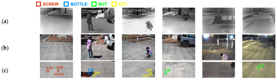 Table 3 compares the mean average precision of different objects under different models. In the case of visible images alone (single mode), the effect of increasing the depth of the network on improving the accuracy of small target detection is not very significant. In contrast, for objects such as bottles, which are significantly larger than the other three types of objects, deepening the depth of the network can improve detection accuracy. By comparing the first and third sets of data in the table, it can be observed that the addition of infrared images improved the detection accuracy for small targets, even without increasing the network depth. Moreover, the detection accuracy for tiny targets such as nuts was enhanced by using infrared images. SLBAF-Net [35] has added an infrared and visible light adaptive fusion layer to the front end of the network, which enhances feature extraction while fusing infrared and visible image feature information, effectively improving the accuracy of small target detection. In order to better preserve the target information in the original image, the model in this paper chooses to directly input the original infrared and visible light images in the initial stage of the network. Subsequently, this paper’s newly established attention module was added to the backbone to improve the accuracy of small target detection further. The experimental results show that the model in this paper has achieved good results in detecting four types of targets: bottle, screw, key, and nut.