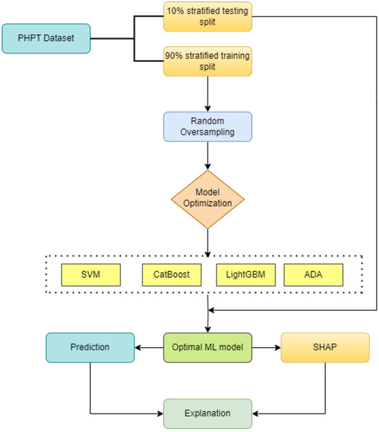 19]. Finally, in the scope of the current study, we explain the prediction process of the most accurate classification model, and we discuss these findings in tandem with the medical literature on the matter of PHPT. Therefore, all in all, the three major contributions of our work can be summed up as follows: (1) the use of only clinical data and indexes to classify PHPT instances; (2) implementing oversampling on the dataset to overcome its imbalanced nature; and, finally, (3) exploring and explaining the black-box mechanics of an ML algorithm to be used in a computer-aided decision-making system for PHTP diagnosis and classification.