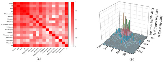 The multi-modal features encompass comprehensive information pertaining to cellular traffic, encompassing the time of traffic occurrence, the volume of traffic at that specific time, the quantity of base stations (BSs), the quantity of points of interest (POIs), and social activities (SAs). The number of base stations reflects the peak value of cellular traffic in this region. No matter how large the traffic load demand in this region is, the peak value of traffic will not exceed the maximum bearing range of the base station. Points of interest (POI) within the region offer insights into the extent of population concentration, with areas containing a larger number of POIs indicating a higher degree of aggregation, as well as SAs. The correlation between multi-modal features and the distribution of cellular traffic, as well as the spatial distribution characteristics of cellular traffic, are depicted in Figure 1.